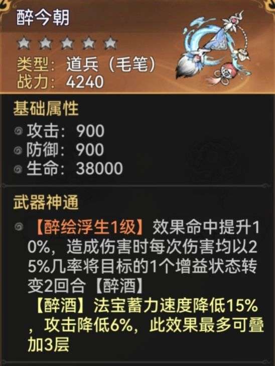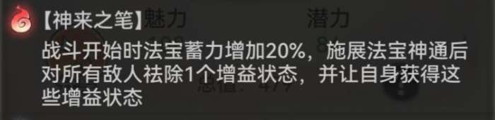 仙笔可根据自身的增益数量增加相应的抗暴几率,并在行动结束时祛除减益,若无减益则增加法宝蓄力。