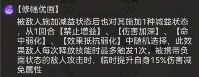 此技能可在被施加减益后对敌方施加减益,且受到携带减益的敌人的伤害降低,即增加了功能性又提高了坦度。