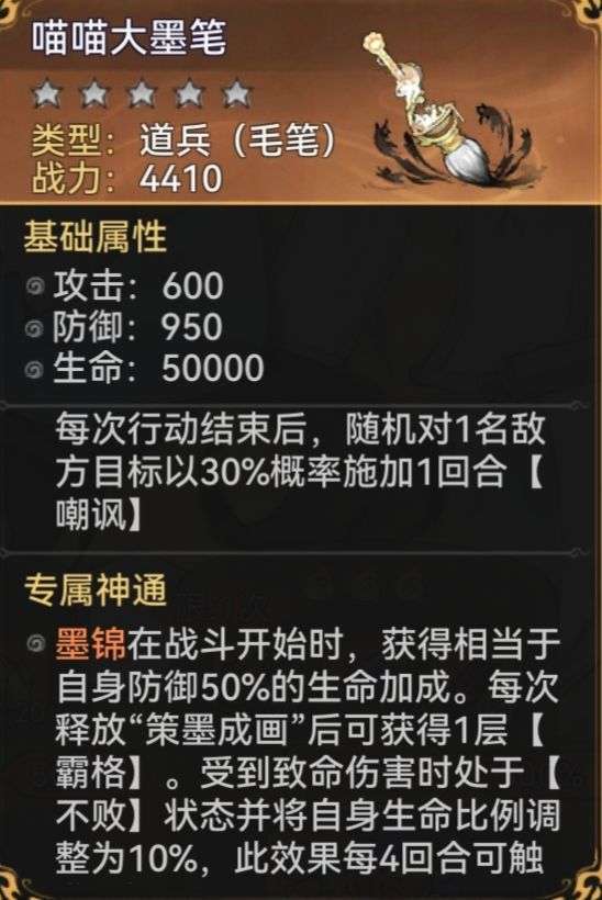 up主认为此道兵对于墨锦来说还是比较重要的,它为墨锦提供了画师急需的保命手段,在一定程度上修补了画师的痛处。并且在此道兵满星后[嘲讽]概率可提升至80%,这个概率还是比较恐怖的。