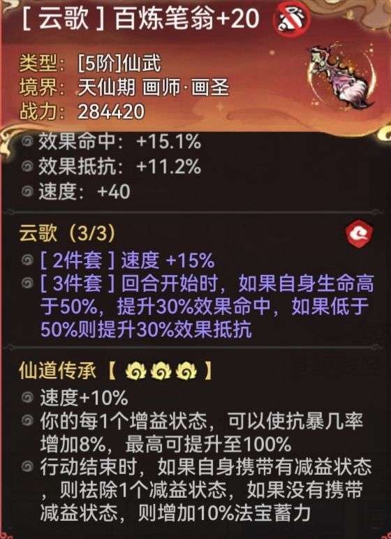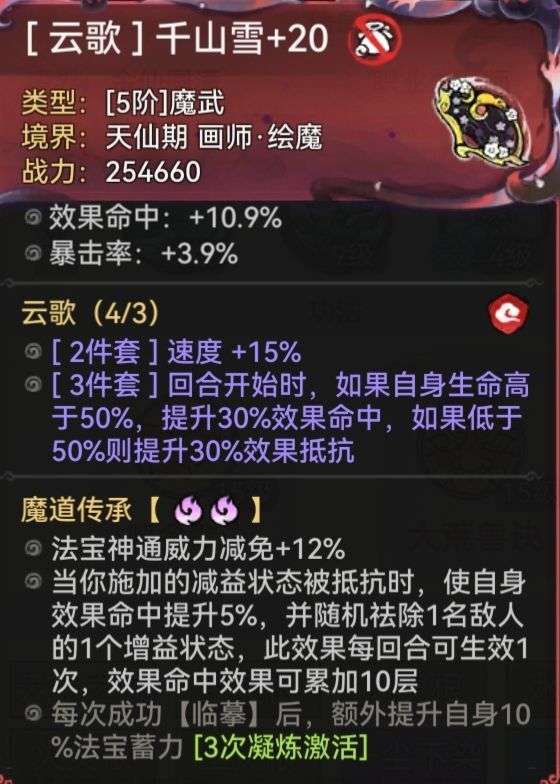 仙画魔画统一推荐[云歌套]增加自身效果命中及速度。