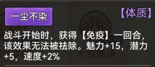 对于速攻画来说,第一回合的发挥尤为关键,即不能被阿璃+魔苜蓿组合毒死,也不能被紫灵反弹减益状态,特别是[禁止增益]和[嘲讽],因此up主只推荐速攻画选择体质[一尘不染],确保墨锦第一回合的稳定发挥。
