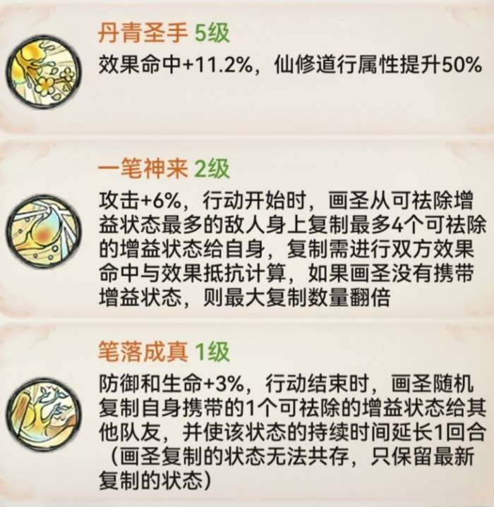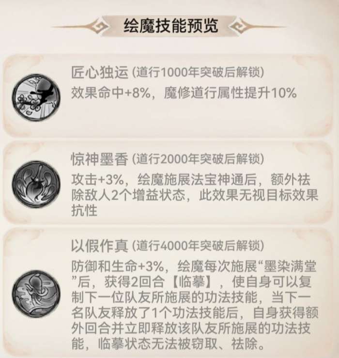 由上可见,魔画的功能为释放法宝神通后无视抵抗祛除两个增益状态,并且施展职业主动技能后会获得2回合[临摹],可复制下一队友释放的功法技能。