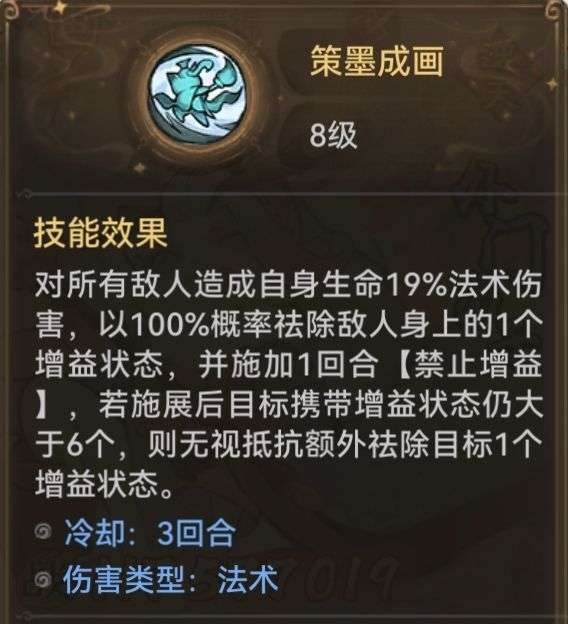 并且墨锦的职业主动技能[策墨成画]在敌方增益大于六个时会额外祛除一个增益状态,此效果基本上只有在战斗的中后期敌方技能完全展开后才能够发挥作用,进一步说明了策划的目的是想要打造一个能够适应长盘作战的弟子而非一两回合就结束战斗的弟子。