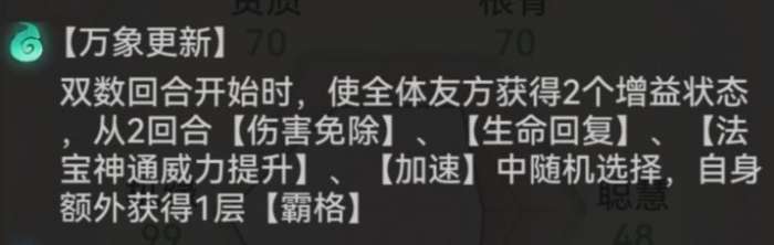 此技能效果强在无需行动,在双数回合开始时即可获得,对于团队的增益效果还是较为明显的,且能使自身额外获得一层[霸格]。