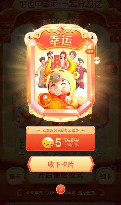 从2月2日00:00到2月11日20:00,用户每天都可以通过抽卡、送卡、领卡等多种形式来自己集卡或帮助亲友集卡。只要集齐金卡,即可瓜分2亿现金,并开启神秘钻卡玩法;只要集齐钻卡,就可再瓜分3亿现金!