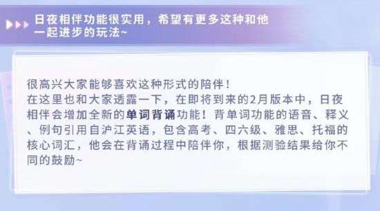 在乙女向游戏《恋与制作人》最新发布的更新预告中,有一条特殊的内容——全新功能:单词背诵。据官方介绍,该功能的词库包含了高考、四六级、雅思、托福等核心词汇,纸片人老公不仅会陪伴、监督你背单词,还会进行背诵测试,劝学、督学、考试一站式服务!