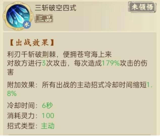 【评价】从开局一直伴随我们到当前几乎永久都可以一用的招式,多频攻击和给力的万魔珠天赋让它独树一帜,目前没有四品。3次攻击每次都可以吃暴击,前期可以当做一个小爆发,后期即使伤害不足也可以当做一个回复技能,它的回复量比专门回复的土系回春系技能还强。