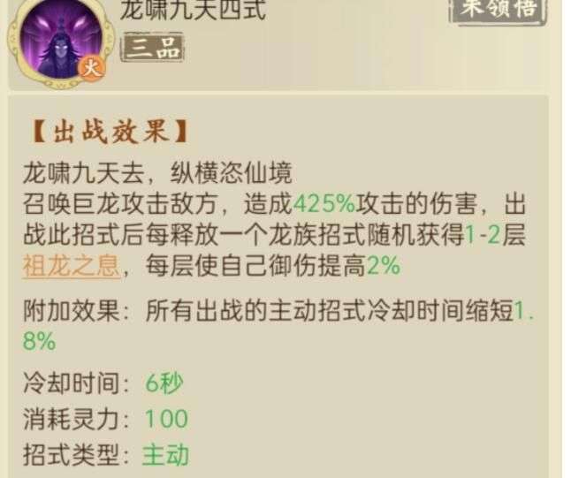 【评价】开局触发伏龙山主线任务,祖龙处直接可以获得三品龙啸(任何身世都给),唯一一个开局就可以拥有的三品招式,前期尤其是开局几天的主力输出招式。万魔珠天赋对于平民而言不算平滑,点不点影响也不大,祖龙之息御伤加成的叠加够多需要上阵多个龙系招式。