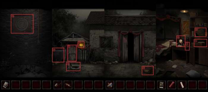 把⑨架子上的纸条放到梳妆台上的⑩镜子上,对称后得到信息【四***八】,离开前带走梳妆台上的⑪红蜡烛。用刚得到的信息打开⑫柴房的门,拿出辘轳头并将其安装到⑬井上。