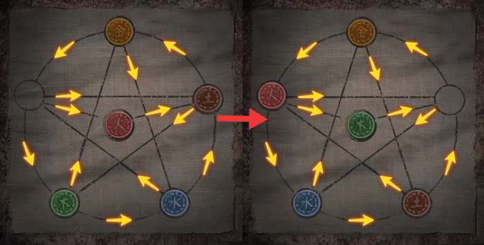 因此我们首先就是要让[木]在中间。也就是说[木]需要先在金的左下方位。那么在[金]不动情况下,就需要先移动[水],然后是[木],再然后是[土]。