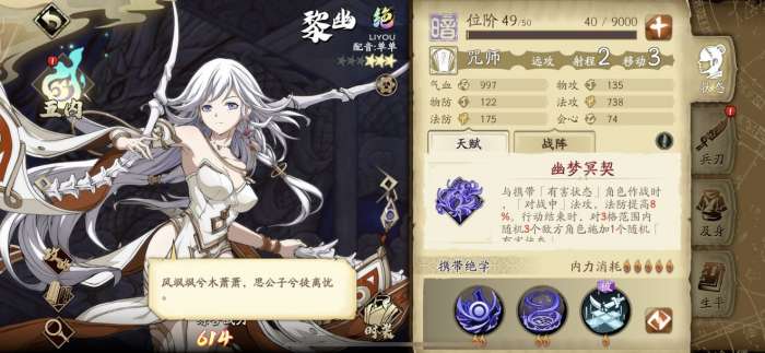 黎幽定位暗系咒师,角色本身自带暗系战阵,天赋在提供伤害加成的同时也能提供额的负面状态。不管是天赋还是战阵,看来黎幽将是未来暗系角色中高质量的角色,而技能也是紧扣施加负面状态和伤害加成。想玩控制流或者未来打算组建暗队的玩家可以考虑这个角色。
