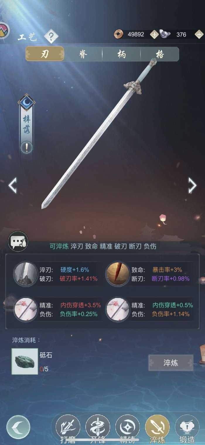 然后是剑脊,剑脊可选有淬刃,重核,轻铸,断刃,反刃,折膝。这里推荐洗出淬刃和折膝,折膝这项属性还是很契合破定流天信的,降低敌方行动力。不建议保留轻铸和重核。