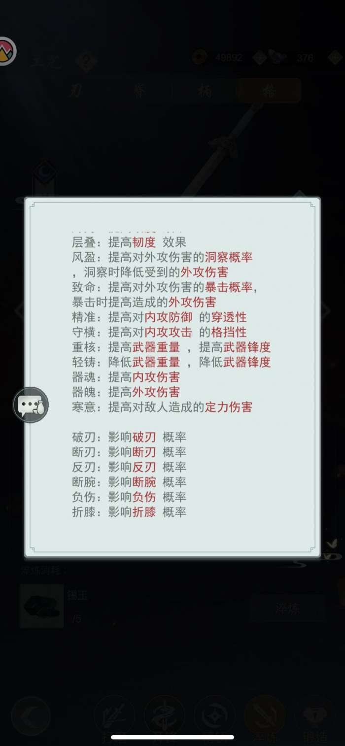 下一项是剑柄,剑柄可洗出的属性有层叠,风盈,守横,破刃,反刃,断腕。这里可洗层叠,守横。因为天信比较害怕内攻,所以守横可以弥补部分不足。
