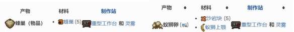 马蜂窝在墓地环境使用5块蜂巢在重型工作台即可制作,蚁狮卵也可以使用5沙岩块和1蚁狮上颚在同样环境制作。快拿去布置陷阱来欢迎你的朋友吧!
