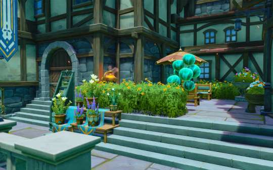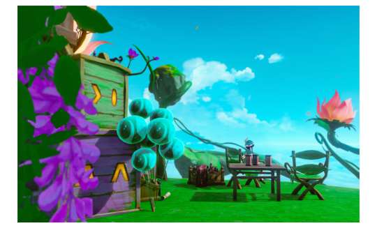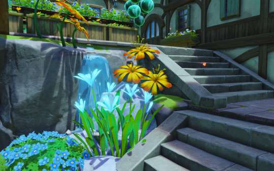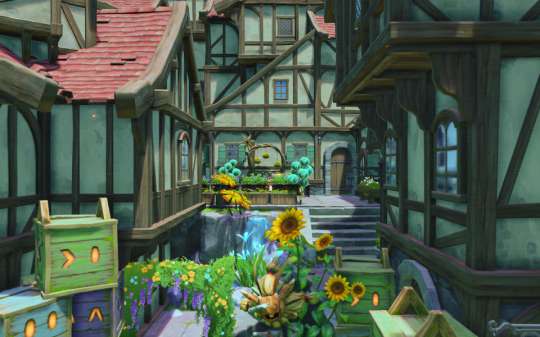 整体设计为城堡与小镇的结合:整体形状似城堡,内部却是小镇街道。房屋四周环绕着奇异的花卉,犹如气球将建筑带向天空。内部的街道上随处可见蓬蓬果。也许蓬蓬果也在向往着天空之上的景色呢?