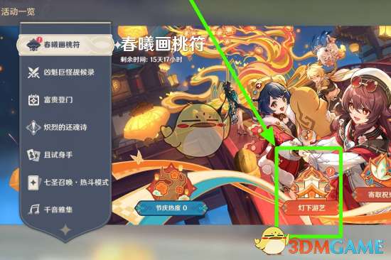 1、进入到活动页面点击如下图所示的春曦画桃符,再点击灯下游艺。