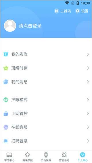 5、在“个人中心”界面,可以看到我的彩旗、班级时刻、我的消息,同时还有护眼模式等功能帮助你更好的进行学习。