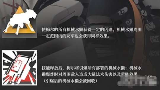 与同样具有召唤能力的辅助干员深海色相比,梅尔所召唤的机械水獭更加具有攻击性,这主要归功于梅尔精英化后的二技能。当梅尔精英化到最高等级后,她所召唤的水獭可以瞬间覆盖数个方格区域。由于法术伤害无法被敌方单位的护甲所抵消,再加上爆炸后带来的眩晕效果,能够有效地处理敌人的大规模攻击。