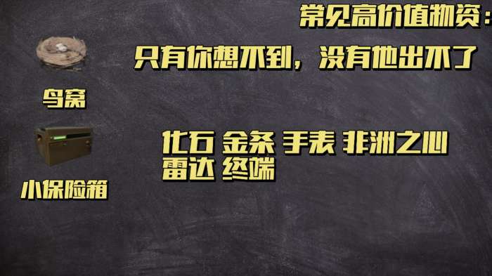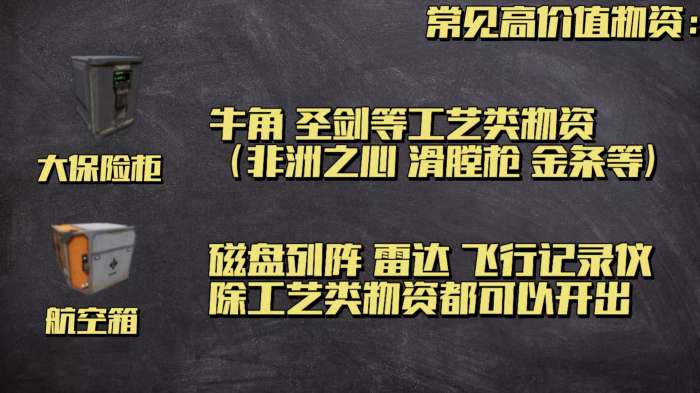 作为人人都要争着开的容器,那开出的物资价值和开出高价值物资的概率可不是盖的,经常出的高价值物品就比如瞪羚、滑膛枪以及非洲之心等等等众多工艺类物资(其实大部分是圣剑和牛角);