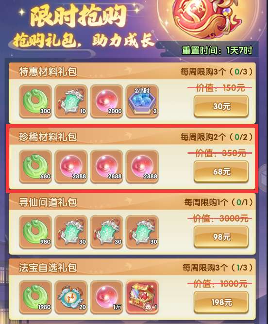 每周限购的【珍稀材料礼包】可买2次,性价比非常高。