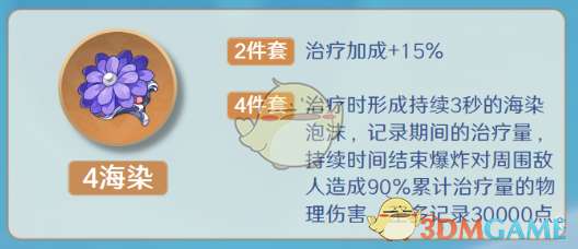 2、三件套效果:装备此圣遗物套装的角色对队伍中的角色进行治疗时,将产生持续3秒的海染泡沫,记录治疗的生命值回复量(包括溢出值)。持续时间结束时,海染泡沫将会爆炸,对周围的敌人造成90%累计回复量的伤害(该伤害结算方式同感电、超导等元素反应,但不受元素精通、等级或反应伤害加成效果影响)。每3.5秒至多产生一个海染泡沫;海染泡沫至多记录30000点回复量,含溢出部分的治疗量;自己的队伍中同时至多存在一个海染泡沫。装备此圣遗物套装的角色处于队伍后台时;依然能触发该效果。