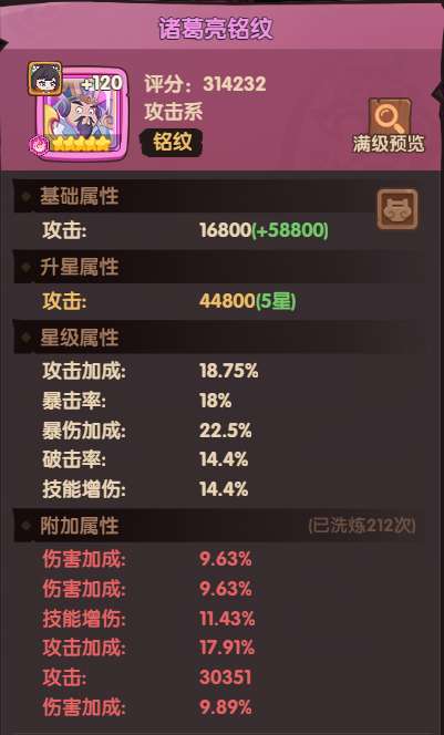 特有属性为伤害加成,铭纹技能能跟自身铭纹特有属性加成配合,又适配诸葛亮铭纹的伤害加成,大幅提升孙尚香的攻击力。属性洗炼:攻击>伤害加成>技能增伤>破击>pve增伤>免控率>控制率