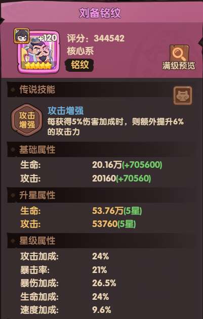 特有属性为伤害加成,除了能直接提升孙尚香伤害上限外,还能跟核心铭纹-刘备的技能效果搭配,大幅提升孙尚香攻击力,增强孙尚香的真伤上限。