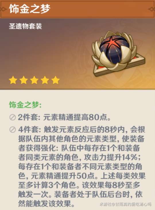 可选,饰金之梦可以在激化队伍中使用,来增加队友的攻击或者精通,缺点是多莉用不上精通词条。