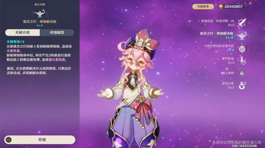元素爆发,多莉召唤一个灯中幽精连接附近的角色:持续回能回血,并获得雷元素附着状态。