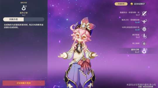 天赋,合成角色或者武器材料时,有25%的概率返还部分材料