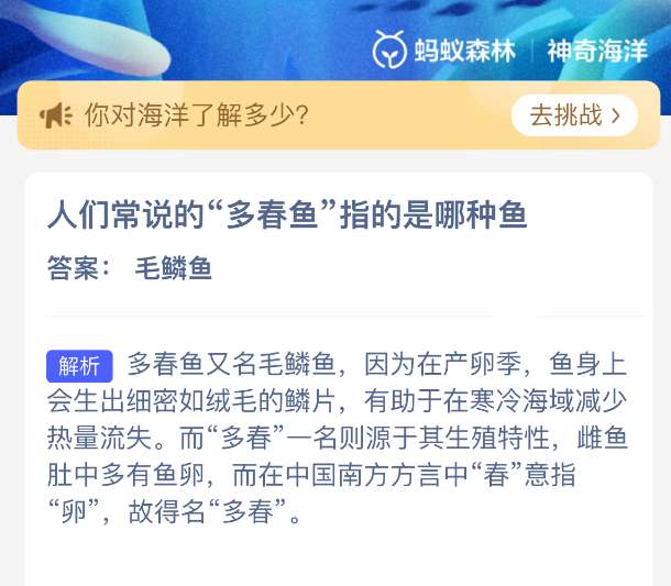 软件提交 专题合集 热门手游人们常说的“多春鱼”指的是哪种鱼?【神奇海洋】2026年4月13日新题目已开答!正确答案现已公布,点击领取拼图,一起为修复海洋生态贡献力量!今日正确答案是:【毛鳞鱼】。多春鱼又名毛鳞鱼,因为在产卵季,鱼身上会生出细密如绒毛的鳞片,有助于在寒冷海域减少热量流失。