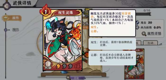 核心武学【双生灵珠】具备三层关键效果:第一,可为目标友方武侠叠加最高30层“有害状态”,每层提升其下一次真气技能1%伤害;第二,本回合己方每损失10%气血,额外赋予1%真气技能增伤;第三,真气技能生效时,行动开始恢复1点真气,并使当回合打出的前6张手牌怒气消耗-1;此外,每使用一张手牌,即随机为一名友方附加1层灼烧。该机制完美串联“自损换输出”与“灼烧持续压场”双轴,配合满经脉状态下全队暴击伤害+8%的被动,使其成为火系真气流与极限自残流的共用支点。