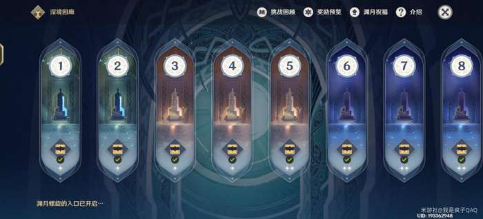 深渊一共有12层,从第五层开始分为上下半场 ,需要组成两个队伍。前八层为一次性奖励的副本,后四成层每半个月更新一次,可重复获得奖励