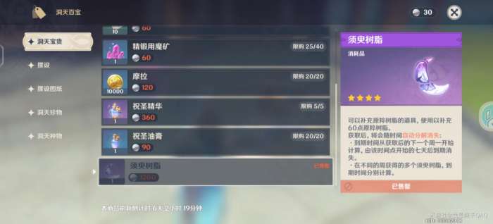 尘歌壶6级解锁须臾树脂,可以用1200尘歌币兑换一个,每个可以分解成60体力,每周至多兑换一个,最多可以存在7天