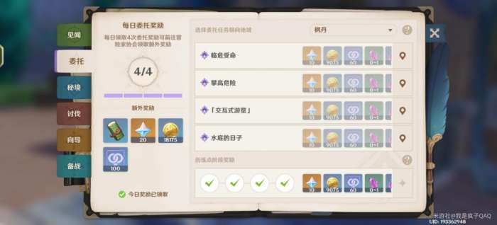 每天可以完成四个委托,每个委托10原石,完成四个委托之后可以到冒险家公会找凯瑟琳额外领取20原石,一共60原石,每天四点更新,是获取原石的重要渠道,记得每天完成