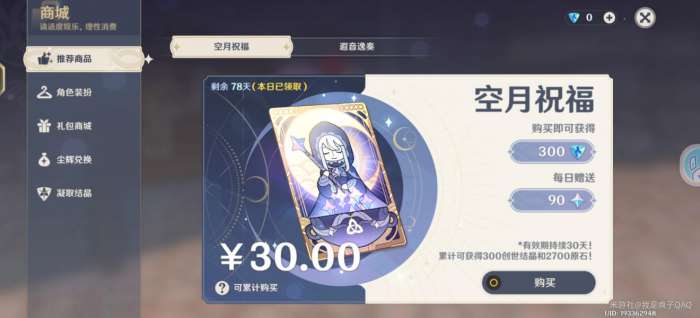 商城中最重要的就是小月卡,也就是空月祝福,购买之后获得300创世结晶,30天内每天登录领取90原石
