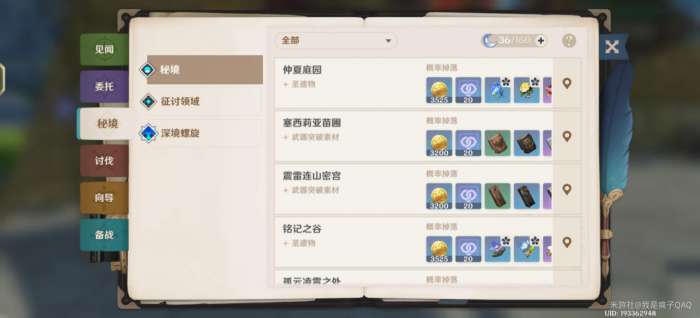 秘境主要有三种,分别是角色天赋、武器材料以及圣遗物秘境,天赋、武器秘境每个国家都一个,每个秘境有三种材料,每天4点更新一种,周日三种材料都有