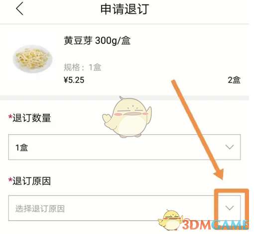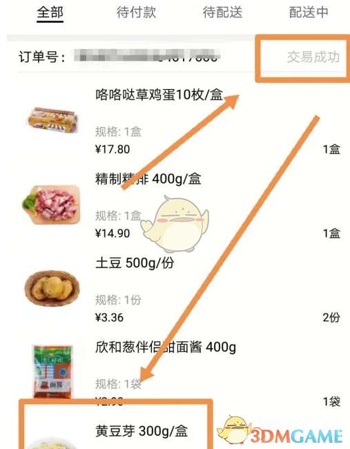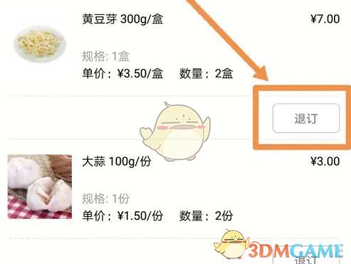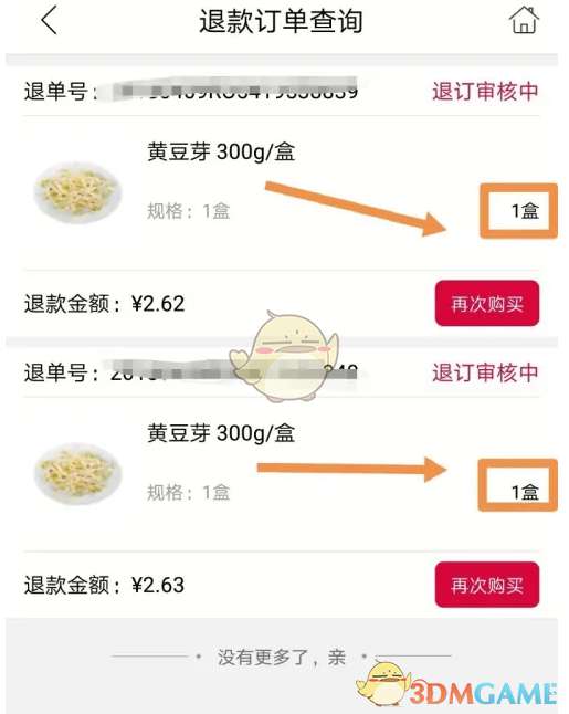3、要退款的是最近一笔订单中的某个商品,点按其中要退款的商品,该商品是黄豆芽,购买了两份,由于缺货,需要退款。
