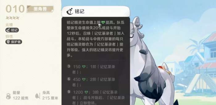 目前游戏当中铭记精灵他们数量越多,达到的羁绊百分比就越高,所以同属性的角色越多的情况下,召唤出来的这个生物也就越强大一些,而且正好目前铭记属性的精灵数量也是比较多的,所以新手的想要更多羁绊的情况下,是可以走这个流派的,想要达到满值也是可以的,Boss只需要战斗之后就立刻触发这个羁绊,带来召唤物的能力,目前根据精灵生命线上面上线的数值,队伍整体的生命数值也是20%,但是战斗一开始的12秒之后,就可以利用这个召唤物,带来一阶情况下150%的提升效果,二阶情况下450的提升效果,最高的情况下是三阶有1200的敌人效果。
