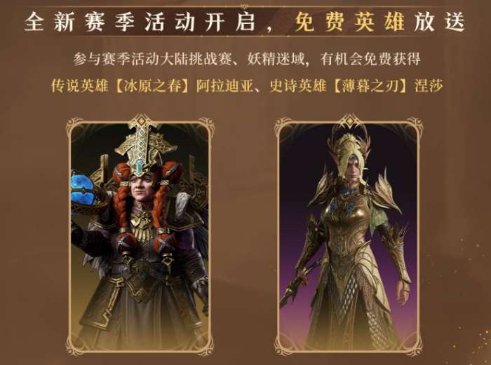 当然了,S3赛季也不会忘记对玩家们的奖励。通过参与赛季活动“大陆挑战赛”和“妖精迷域”,你有机会免费获得传说英雄【冰原之春】阿拉迪亚,以及史诗英雄【薄暮之刃】涅莎,为你的队伍增添强力的战力。
