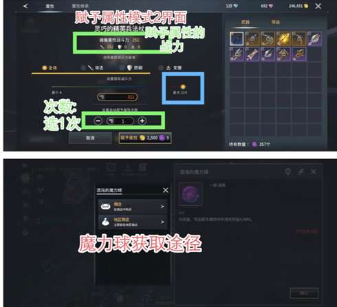 注:装备赋予属性需要消耗一定数量的魔力球,可以在商店购买或英雄商人那里对换少量魔力球。