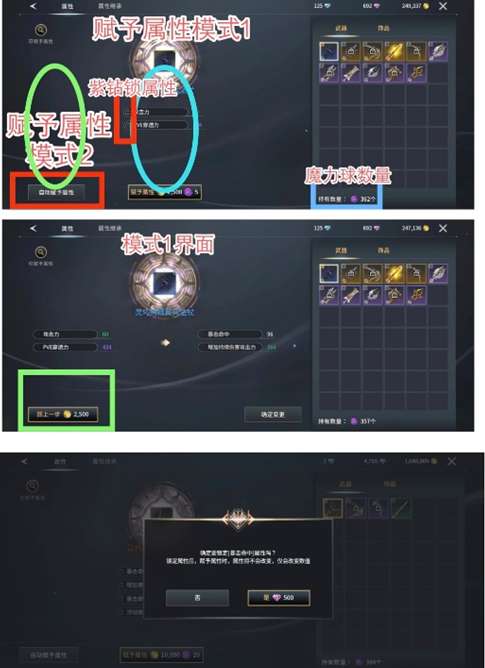 2、模式1可以用紫钻锁属性,但是不能锁数值,比如锁攻击力属性,数值是900,再次赋予属性后攻击力属性还在,数值就是随机也许是60也许是100。