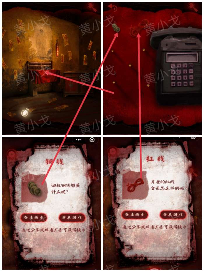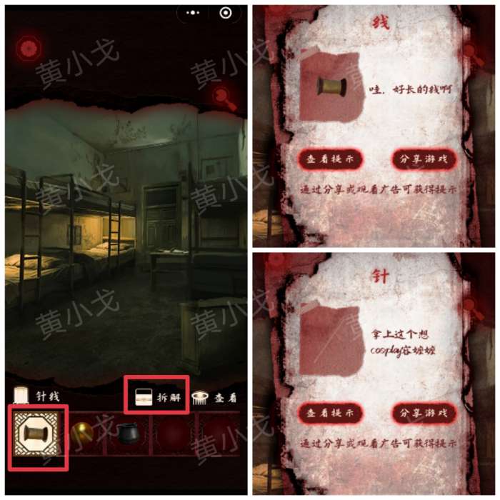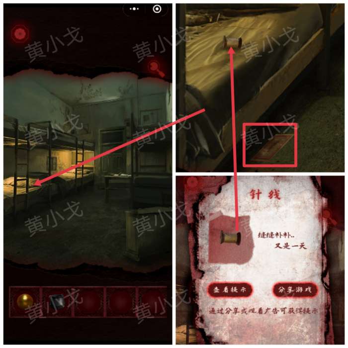 4.点击左侧靠后的床铺,获得【针线】;点击地上的纸钱,出现纸手