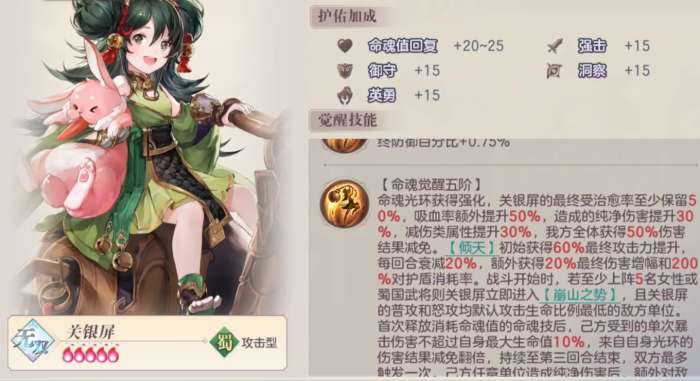 “崩山之势”使关银屏的攻击必定命中,增伤属性提高30%,并无视敌方20%防御力,虽然无法触发破甲效果,但其破甲率会转化为等量的暴击率与伤害加成。当命魂升至三阶时,将开启团队光环,使我方所有女性和蜀国武将的护盾消耗效率提升100%,同时全队获得30%的受到最终伤害减免。
