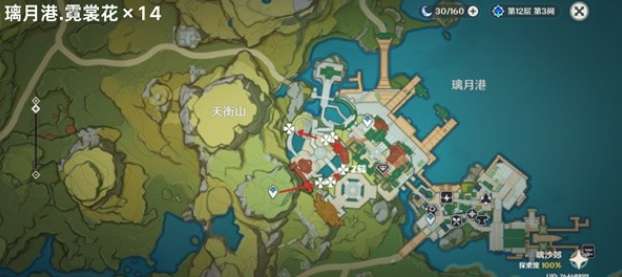 1、璃月港区域,可以获得霓裳花十四朵,全部分布在天衡山锚点下方的公园中,位置如图。