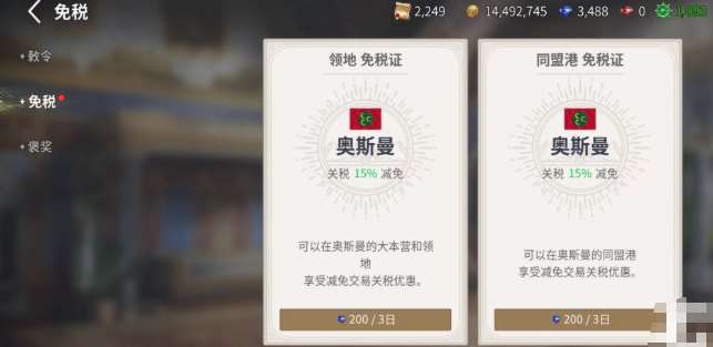 在实际应用减免关税的政策时,也需要结合游戏的整体机制来进行规划,才能够达到减免效果的最大化,首先要明确的是免税证的减免需要和其他的减税因素进行配合,玩家在自己所处的港口交易的时候本身就会享受到一定程度的基础税收优惠,这时候关税减免的作用不会特别突出,但如果进行跨国贸易,尤其是那些税率本身就较高的,港口交易的时候面对上带来的减税效果就会非常明显,这就是可以关注于跨国贸易的玩家,优先把资源投入到核心贸易路线途径的国家免税证获取上。