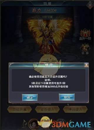 1、翅膀提升分为两种升阶途径:金币提升和神羽提升。