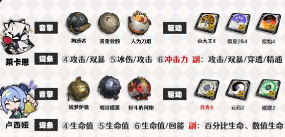 思路便是“海莉+击破+增益角色”的组合,莱卡恩能减冰抗、提高失衡易伤,橘福福能提供暴伤、喧响值回复,扳机能提供常态易伤;卢西娅是最佳增益角色,持续延长以太帷幕,也可用潘引壶暂替。