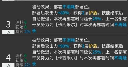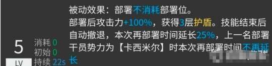 智能小帮手二技能是被动效果,部署不需要消耗部署位并且会在部署后拥有160%的攻击力和4层护盾。技能持续27秒并且在结束后会自动撤退,同时再部署时间会延长25%,但如果上一名部署干员是卡西米尔,则不会延长再部署时间。与蓝蒂相比,智能小帮手的二技能相当于加强版。