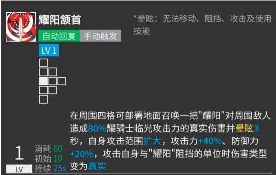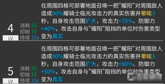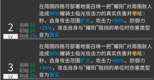 我的第二项技能是可以在周围四个格子内部署一把名为“耀阳”的武器。这把武器可以对周围的敌人造成110%的真实伤害,并使其晕眩3秒。同时,我的攻击范围也会扩大,攻击力增加至140%,防御力为100%。如果我攻击到被“耀阳”挡住的单位,也能够对其造成真实伤害。此技能需要初始SP值25,消耗SP值40,持续时间为25秒。值得注意的是,“耀阳”是一种召唤物,它有6000的生命值,攻击力为10,防御力为600,法术抵抗为20。只要你能把它安置得合理,它就可以成为一个强大的防御援助,因为它既结实又能够挡住两个单位。